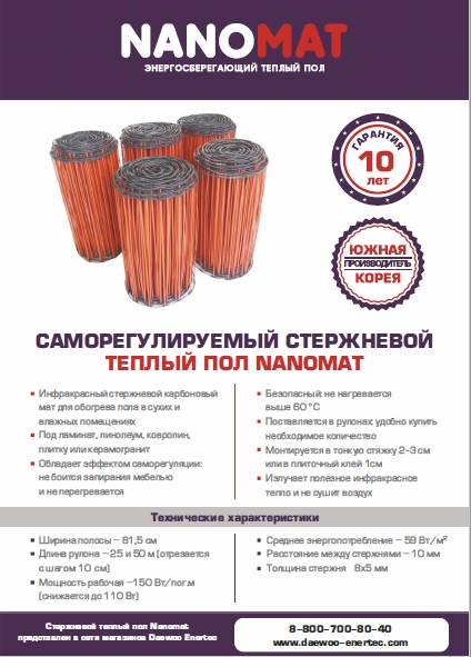 Саморегулируемый инфракрасный стержневой мат Наномат– это теплый пол для монтажа в плиточный клей или тонкую цементно-песчаную стяжку. Подходит для работы в сухих и влажных помещениях. Укладывается под любые напольные покрытия, кроме пробки и деревянной доски для пола.