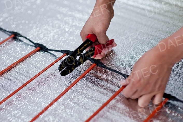 2 этап. Разложите мат на полу: резать можно только токоведущий черный кабель, стержни – нельзя. Соедините параллельно. Закрепите гофротрубку с температурным датчиком.